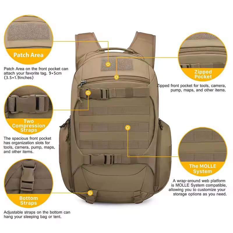 Large Capacity--the military pack can place personal belongings, clothing, daily necessities, electronic products, outdoor equipment, etc. Suitable for outdoor travel, camping, hiking and other outdoor activities. Colors, sizes, materials ,logo , all features can be customized according to your needs.